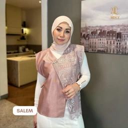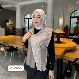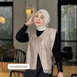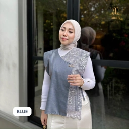 Vest dengan kombinasi bahan brokat dan polos yang memberi kesan mewah namun tetap modern.
