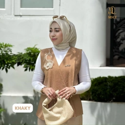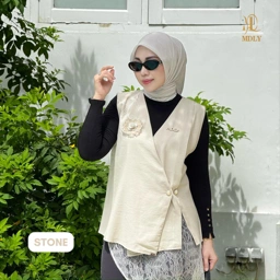 Vest elegan dengan desain wrap asimetris, dihiasi detail bordir dada dan bunga 3D yang menonjol cantik.