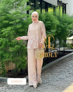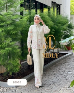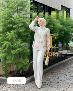 One set daily kemeja dan pants dengan bahan silk premium yang lembut, adem, dan jatuh Looksnya simple dan terdapat aksen motif ethnic di kemeja yang menambah kesan manis