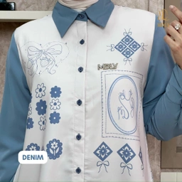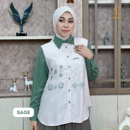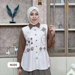 Atasan two-tone dengan sentuhan ethnic pattern yang bikin look terlihat unik tapi tetap modest. Kombinasi warna soft dan detail pattern-nya memberi kesan artsy, clean, dan cocok untuk daily chic style.