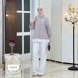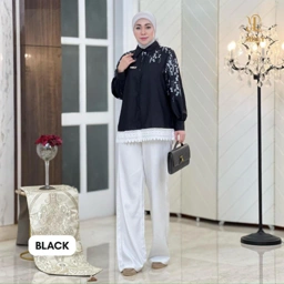 Atasan dengan sentuhan floral yang manis di bagian lengan, dipadukan dengan detail renda di bagian bawah yang memberikan kesan feminin dan elegan